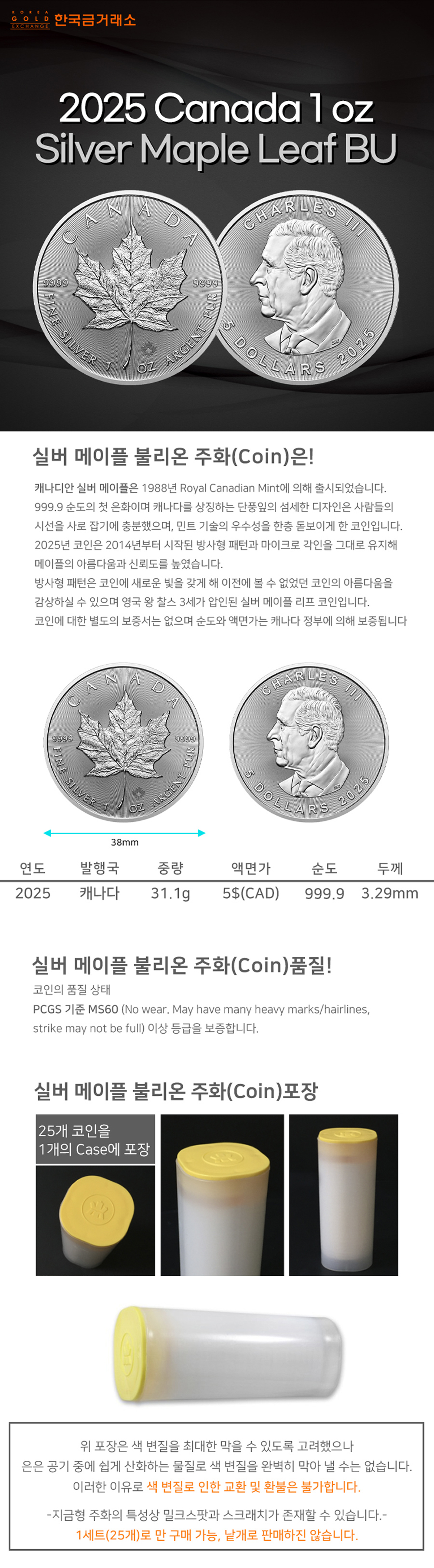 • 2025 1온스 실버 메이플 불리온 주화(Coin) 5$(CAD) 25ea